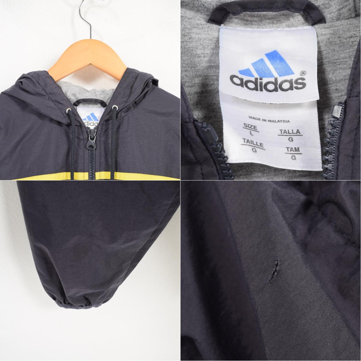 商品詳細ブランド・adidas・アディダス・特徴・3本ライン・ポリコットンライナー・モデル/形状・ナイロンパーカー・素材・ナイロン:100%・色・ブラック系 黒色・柄・ワンポイント・生産国・マレーシア製・年代・90年代・サイズ・メンズM・表記サイズ:L・着丈:63.5cm・身幅:56cm・肩幅:46cm・袖丈:59cm・コンディション・B・カテゴリ・メンズ・ジャケット・ナイロンジャケット・ウインドブレーカー・アウター・商品番号・wan2432・取扱店・ネットショップ・スタッフコメントadidas ナイロンパーカー / メンズM / 商品番号 wan2432※写真の箇所に(フード)ダメージがあります。